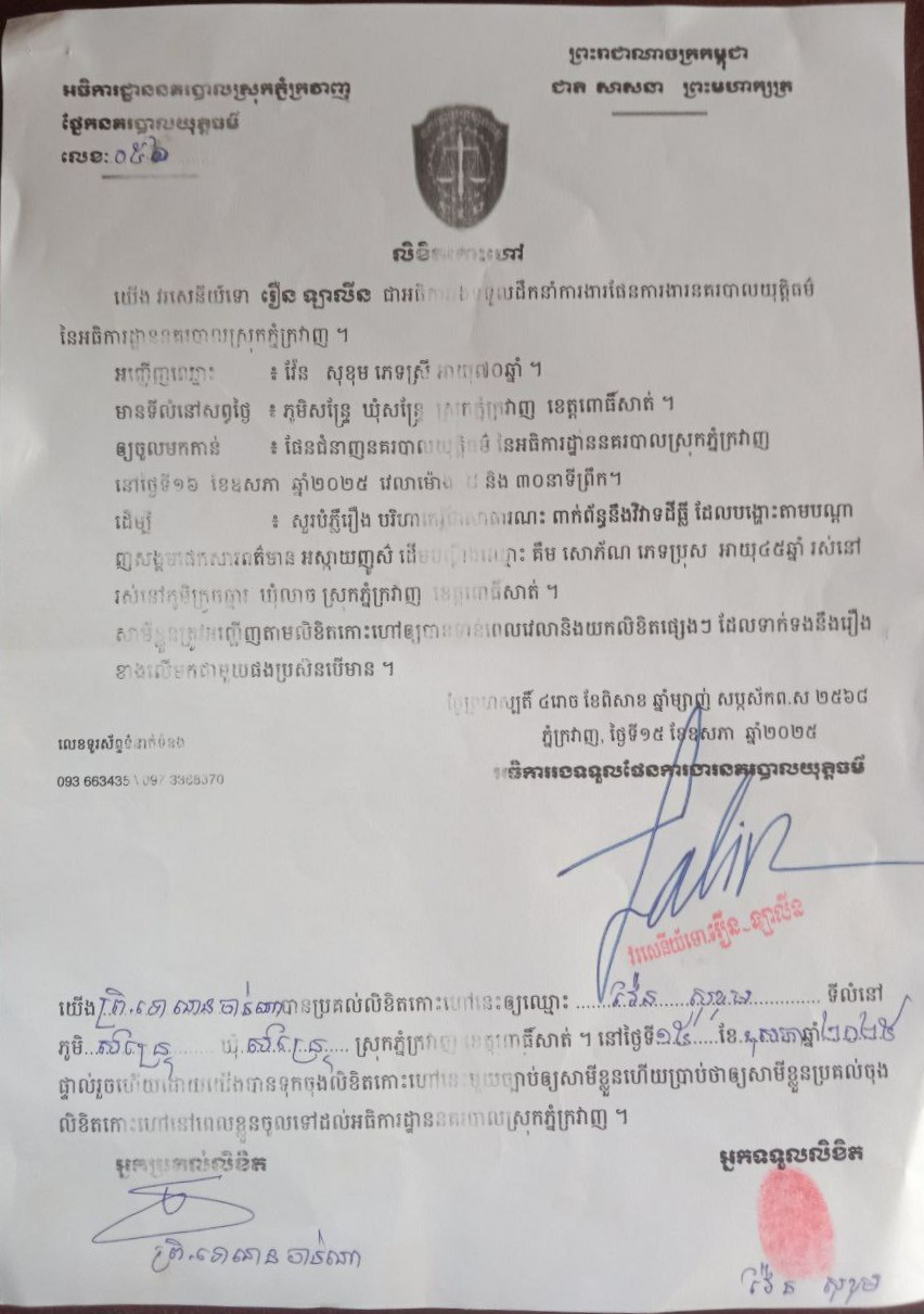 ក្រោយពីកិច្ចសម្ភាសន៏រវាងអ្នកសារព័ត៌នៃអង្គភាពអស្កាយញូសិ៍ ជាមួយលោកស្រី វ៉ែន សុខុម ដែលបានបញ្ចាក់ថាលោកស្រីទទួលបានភាពអយុត្តិធម៌ពីលោក គឹម សោភ័ណ ស្មៀនឃុំសន្ទ្រែ រឿងទំនាស់ដី ស្រាប់តែនៅថ្ងៃទី១៥ ខែឧសភា ឆ្នាំ២០២៥ លោកស្រី ត្រូវបានអធិការនៃអធិការដ្ឋាននគរបាលស្រុកភ្នំក្រវ៉ាញ ចេញលិខិតកោះហៅលេខ ០៥៦ តាមបណ្តឹងរបស់លោក គឹម សោភ័ណ ភេទប្រុស អាយុ ៤៥ឆ្នាំ រស់នៅភូមិក្រូចឆ្មារ ឃុំលាច ស្រុកភ្នំក្រវ៉ាញ ខេត្តពោធិ៍សាត់ ឱ្យចូលបំភ្លឺនៅថ្ងៃទី១៦ ខែឧសភា ឆ្នាំ២០២៥ខាងមុននេះ ករណីនេះពិតជាលឿនមែន។