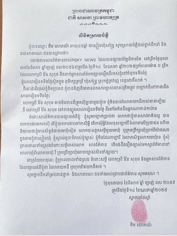 ខេត្តពោធិ៍សាត់៖ កាលពីថ្ងៃទី១៤ ខែឧសភា ឆ្នាំ២០២៥ អង្គភាពអស្កាយញូសិ៍យើង ត្រូវបានទទួលការពឹងពាក់ឱ្យជួយផ្សព្វផ្សាយពីលោកស្រី វ៉ែន សុខុម អតីតមេឃុំសន្ទ្រែ ឆ្នាំ២០០២ ដល់ឆ្នាំ២០០៧ ជាស្ត្រីមេម៉ាយ ដែលមានទំនាស់វិវាទដីជាមួយនិង លោក គឹម សោភ័ណ ស្មៀនឃុំសន្ទ្រែ តាំងពីឆ្នាំ២០០២។
