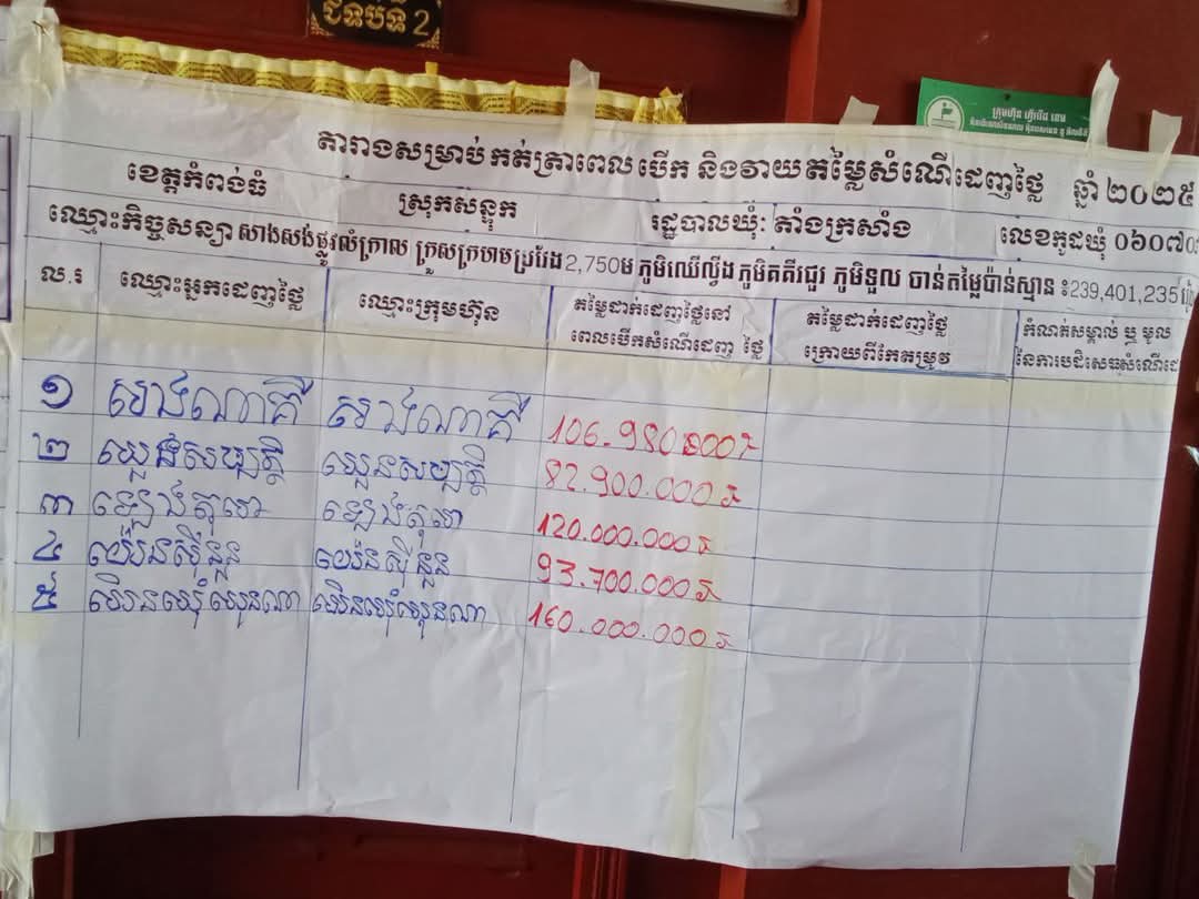 ខេត្តកំពង់ធំ៖ ប្រជាពលរដ្ឋមានការហួសចិត្តជាមួយនិងការរៀបចំដេញថ្លៃគម្រោងមូលនិធិអភិវឌ្ឍន៍ឃុំ/សង្កាត់ សាងសង់ផ្លូវបេតុងអាមេប្រវែង ៣០០ម៉ែត្រ និងទទឹង ០៥ម៉ែត្រ ក្នុងតម្លៃប៉ាន់ស្មាន ១៧២,៦៨១,៤៦៥រៀល (មួយរយចិតសិបពីរលាន ប្រាំមួយរយប៉ែតសិបមួយពាន់បួនរយហុកសិបប្រាំរៀល) នៅឃុំព្នៅ ស្រុកសន្ទុក ខេត្តកំពង់ធំ។ ខណៈដែលគេសង្កេតឃើញមាន ត្រឹមតែ៣ក្រុមហ៊ុនប៉ុណ្ណោះបានចូលរួមដេញថ្លៃ ក្នុងពេលដែលគេសង្កេតឃើញមានតំណាងក្រុមហ៊ុនជាច្រើនទៀតបានទៅចូលរួមដែរ តែគេមិនដាក់សំណើរបស់ពួកគេ ខណៈក្នុងការដេញថ្លៃគម្រោងនេះត្រូវបានទៅលោក គាត ណាវីន ក្រុមហ៊ុនឈ្មោះ គាត ណាវីន ដែលបានដាក់តម្លៃទាបជាងគេគឺ ១៧០,១០០,០០០រៀល (មួយរយចិតសិបលាន មួយរយពាន់រៀលគត់) ដោយចុះបានត្រឹមតែ ២,៥៨១,៤៦៥៛ (ពីរលាន ប្រាំរយប៉ែតសិបមួយពាន់ បួនរយហុកសិបប្រាំរៀលគត់) បើគិតជាមធ្យមតម្លៃសំណង់នោះគឺមានតម្លៃខ្ពស់កប់ពពកស្មើនឹង១១៣៤០០រៀលក្នុង១ម៉ែត្រក្រឡា។