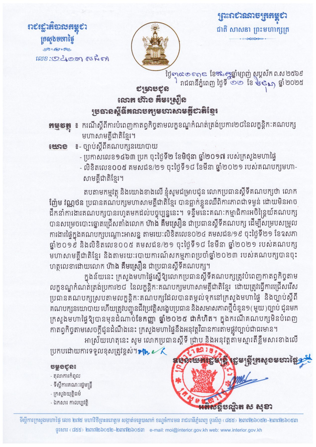 រាជធានីភ្នំពេញ៖ នៅថ្ងៃទី១១ ខែមិថុនា ឆ្នាំ២០២៥ ឯកឧត្តមអភិសន្តិបណ្ឌិត ស សុខា ឧបនាយករដ្ឋមន្រ្តី រដ្ឋមន្ត្រីក្រសួងមហាផ្ទៃ បានជម្រាបជូនលោក ហ៊ាង គឹមសឿន ប្រធានស្តីទីគណបក្សមហាសាមគ្គីជាតិខ្មែរ ស្តីពីការបំពេញកាតព្វកិច្ចតាមលក្ខខណ្ឌកំណត់ត្រង់ប្រការ២៨ នៃលក្ខន្តិកៈគណបក្សមហាសាមគ្គីជាតិខ្មែរ។