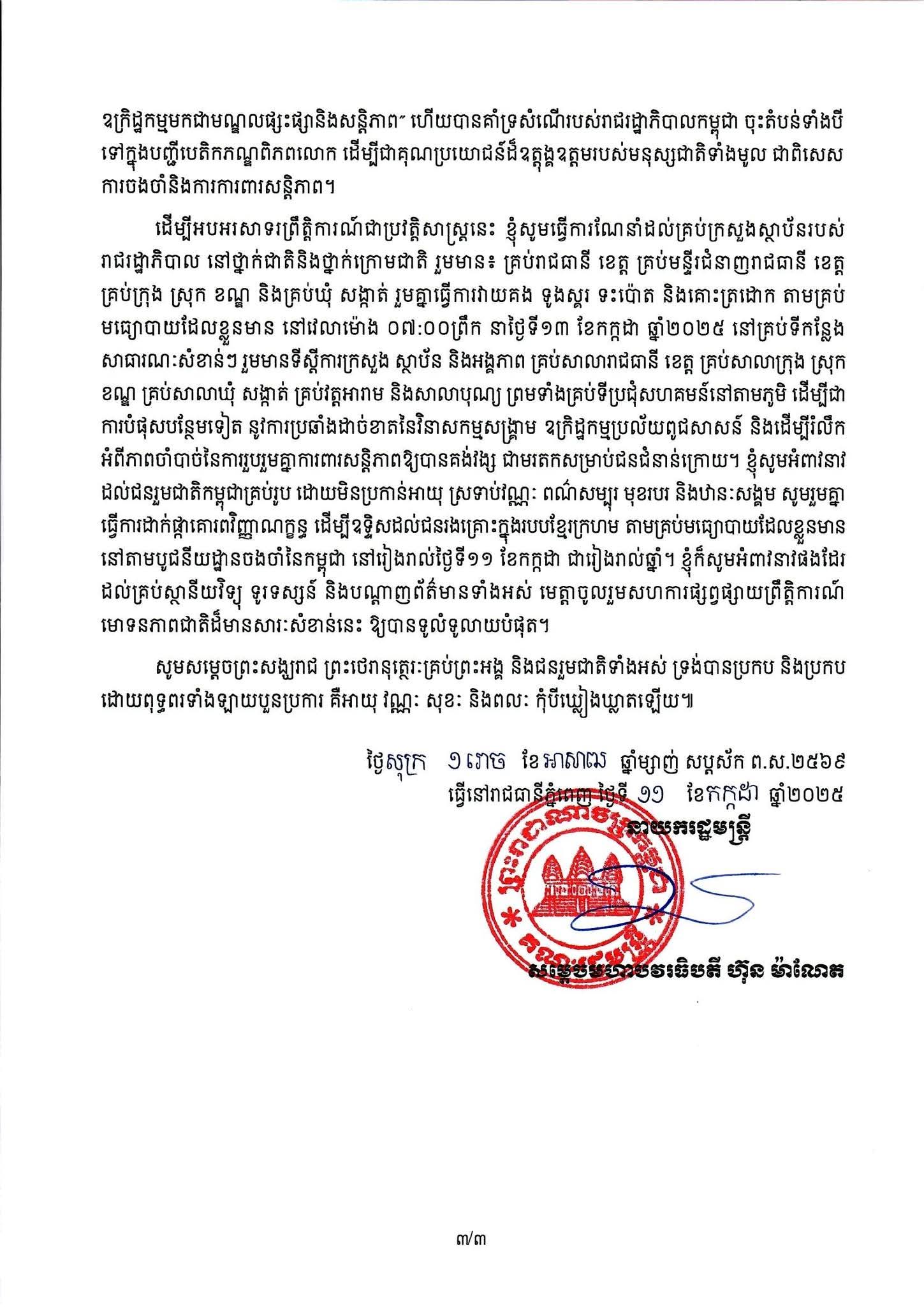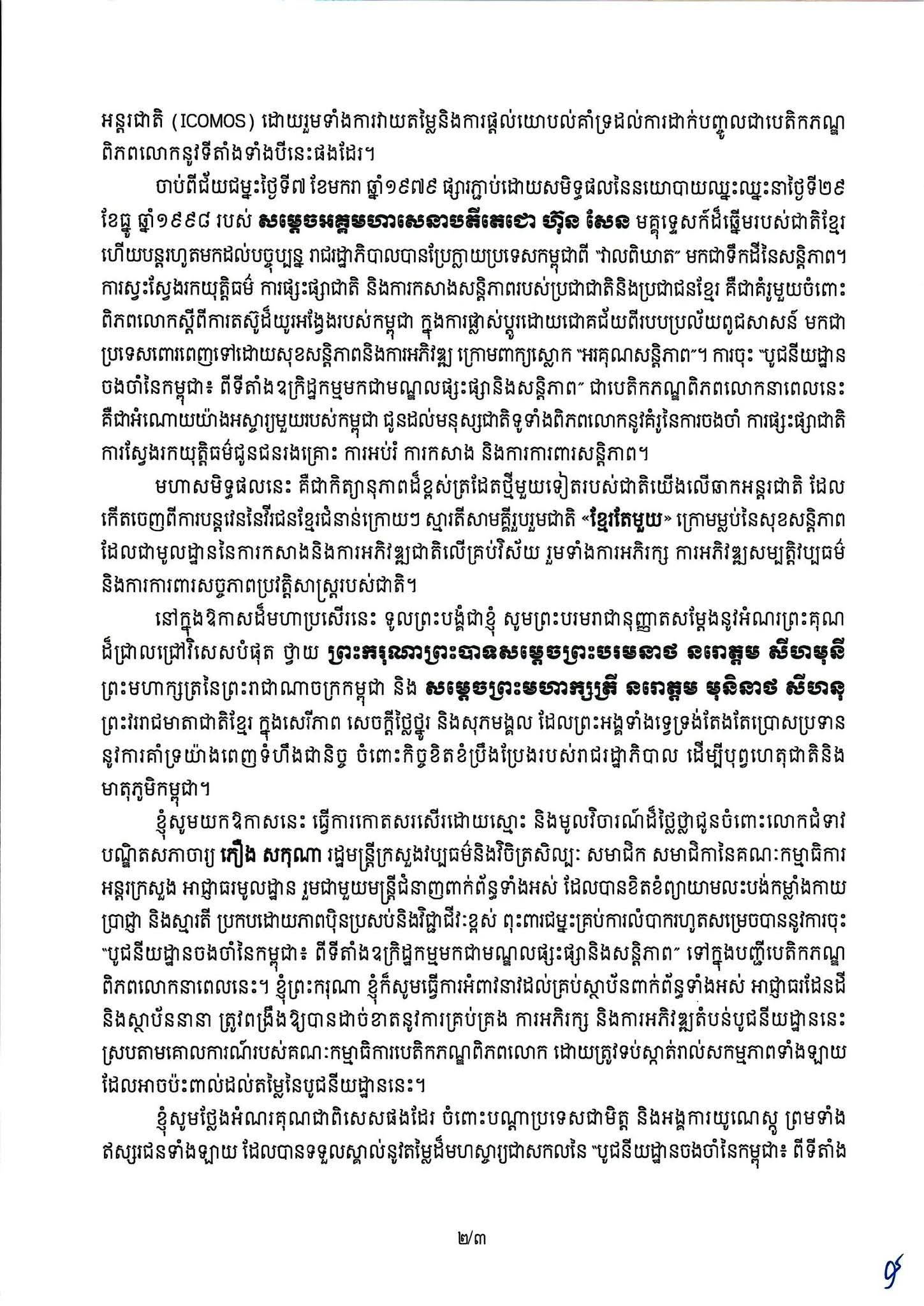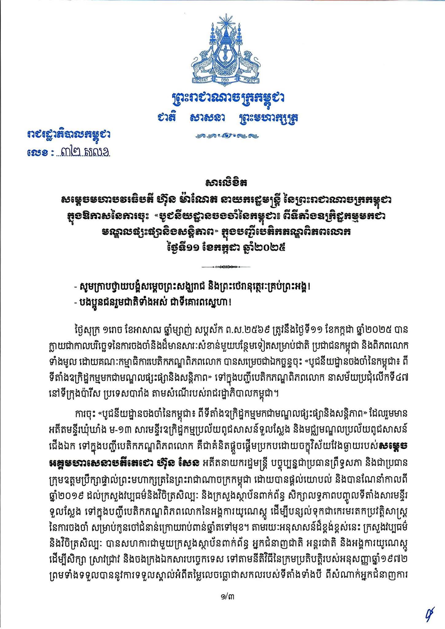 សារលិខិត សម្តេចមហាបវរធិបតី ហ៊ុន ម៉ាណែត នាយករដ្ឋមន្ត្រី នៃព្រះរាជាណាចក្រកម្ពុជា ក្នុងឱកាសនៃការចុះ «បូជនីយដ្ឋានចងចាំនៃកម្ពុជា៖ ពីទីតាំងឧក្រិដ្ឋកម្មមកជា មណ្ឌលផ្សះផ្សានិងសន្តិភាព» ក្នុងបញ្ជីបេតិកភណ្ឌពិភពលោក ថ្ងៃទី១១ ខែកក្កដា ឆ្នាំ២០២៥ ។