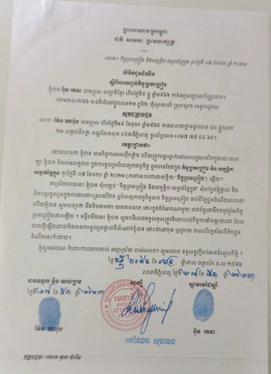 សម្រាប់លោក ម៉ែន ណារ៉ុង វិញ ចាប់តាំងពីលោកបានមើលឃើញទង្វើក្បត់ និងរំលោភកិច្ចសន្យារបស់លោក តុល ចំរើន រួចមក លោកក៏បានចាត់វិធានការច្បាប់ដោយដាក់ពាក្យបណ្តឹងជំទាស់ និងទប់ស្កាត់ទៅអាជ្ញាធរគ្រប់លំដាប់ថ្នាក់ រាប់ចាប់ពីមូលដ្ឋានរហូតដល់ក្រសួងរៀបចំដែនដី នគរូបនីយកម្ម និងសំណង់ នូវរាល់សកម្មភាពរំលោភបំពានរបស់លោក តុល ចំរើន ក្នុងចេតនាបន្លំយកដីលោក ម៉ែន ណារ៉ុង ក្រោមរូបភាពផ្សេងៗ។ ហើយជាមួយគ្នានោះលោកក៏បានប្តឹងរំលាយកិច្ចសន្យាដែលបានធ្វើឡើងកាលពីដើមឆ្នាំ២០២១ផងដែរ ប៉ុន្តែបុគ្គលឈ្មោះ តុល ចំរើន បានគេចវេសមិនព្រមផ្តិតមេដៃដោយហេតុថា ខ្លួនមានគោលបំណងបន្តរំលោភយកដី លោកម៉ែន ណារ៉ុង បន្តទៀត។ ចំណែកឯលោក អ៊ិម រតនា ដែលជាមិត្តភក្តិលោកម៉ែន ណារ៉ុង និងជាអ្នកណែនាំលោក តុល ចំរើន មកឱ្យលោក ម៉ែន ណារ៉ុង ស្គាល់ និងឈានដល់ចុះកិច្ចព្រមព្រៀងជាមួយនោះ លោក អ៊ិម រតនា ដោយមើលឃើញទង្វើល្មើសច្បាប់ និងអយុត្តិធម៌ដែលបុគ្គលឈ្មោះ តុល ចំរើន ធ្វើមកលើលោក ម៉ែន ណារ៉ុង នោះ លោក អ៊ិម រតនា ក៏បានសម្រេចចិត្តបញ្ចប់កិច្ចព្រមព្រៀងជាមួយលោក ម៉ែន ណារ៉ុង កាលពីថ្ងៃទី២៧ ខែមីនា ២០២៣ កន្លងទៅក្នុងនាមលោក អ៊ិម រតនា ជាភាគី “ខ” រួមជាមួយលោក តុល រើន នៅឡើយតែបុគ្គលឈ្មោះ តុល ចំរើន ជាមនុស្សប្រយោលដែលត្រូវបានគេណែនាំឱ្យលោក ម៉ែន ណារ៉ុង សោះ មានចិត្តលោភលន់នៅអង្កៀមចង់បានទ្រព្យរបស់អ្នកដទៃដោយគ្មានការអៀនខ្មាស់អ្វីបន្តិចសោះឡើយ។