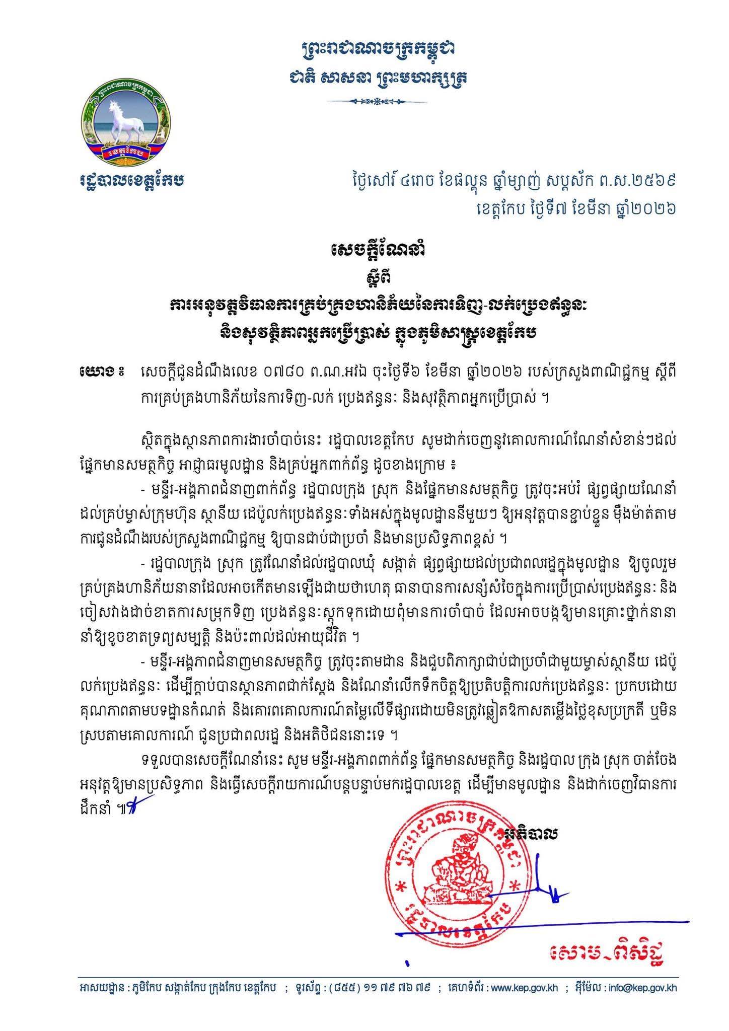 ខេត្តកែប៖ យោងតាមលិខិតចុះថ្ងៃទី០៧ ខែមីនា ឆ្នាំ២០២៦ របស់រដ្ឋបាលខេត្តកែប ឯកឧត្តម សោម ពិសិដ្ឋ បានណែនាំដល់អាជ្ញាធរក្រុង-ស្រុក និងមន្ទីរជំនាញពាក់ព័ន្ធ ត្រូវបន្តតាមដាន និងអនុវត្តវិធានការបន្ទាន់ ដោយតម្រូវឱ្យគ្រប់ស្ថានីយប្រេងឥន្ទនៈទាំងអស់ត្រូវបន្តបើកដំណើរការលក់ជូនប្រជាពលរដ្ឋជាធម្មតា ព្រមទាំងទប់ស្កាត់ដាច់ខាតនូវការទិញក្នុងទ្រង់ទ្រាយធំដើម្បីស្តុកទុកដែលបង្កការរាំងស្ទះដល់ការផ្គត់ផ្គង់ ។